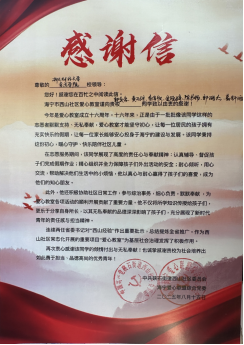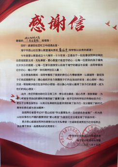 近日,学院社工系教师石卷苗带领8名员工(郭奕含、黄子柠、李佳欣、金冠婷、陈书扬、郭鸿杰、葛科洒、鲁涵宇)于暑期赴海宁市砚石街道西山社区参与“爱心教室”志愿服务活动,圆满完成志愿服务任务,并获得社区高度认可。西山社区特向学院发来感谢信,对我院学子的无私奉献与扎实付出表示诚挚感谢。