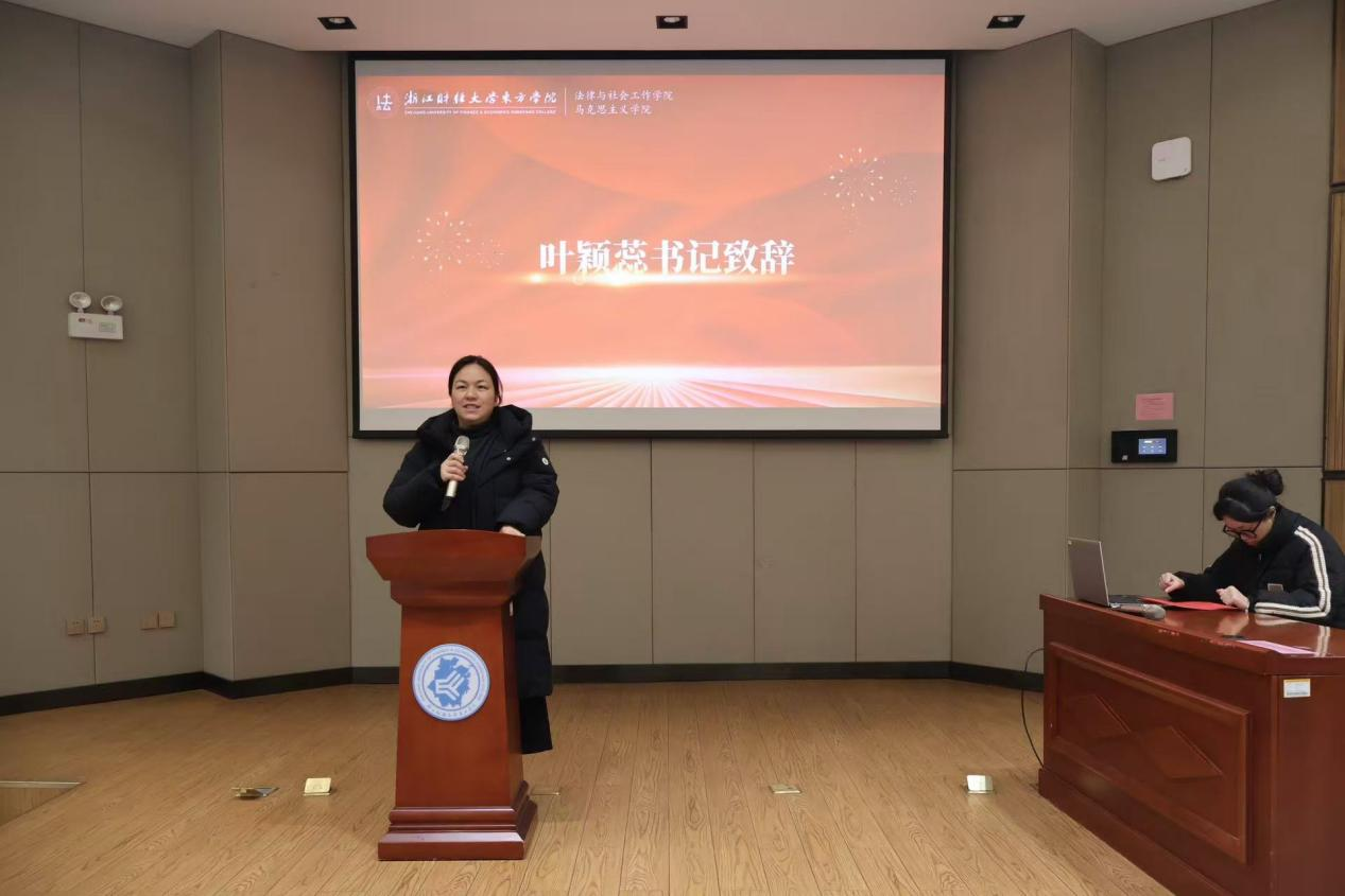 法社公司党总支书记叶颖蕊上台致辞。她首先对员工的到来表示欢迎,感谢鼎源奖学金对学院发展的支持,并向所有通过国家统一法律职业资格考试的同学表示祝贺。她勉励获奖学子继续发挥榜样作用,同时鼓励全体同学脚踏实地、奋发前行。