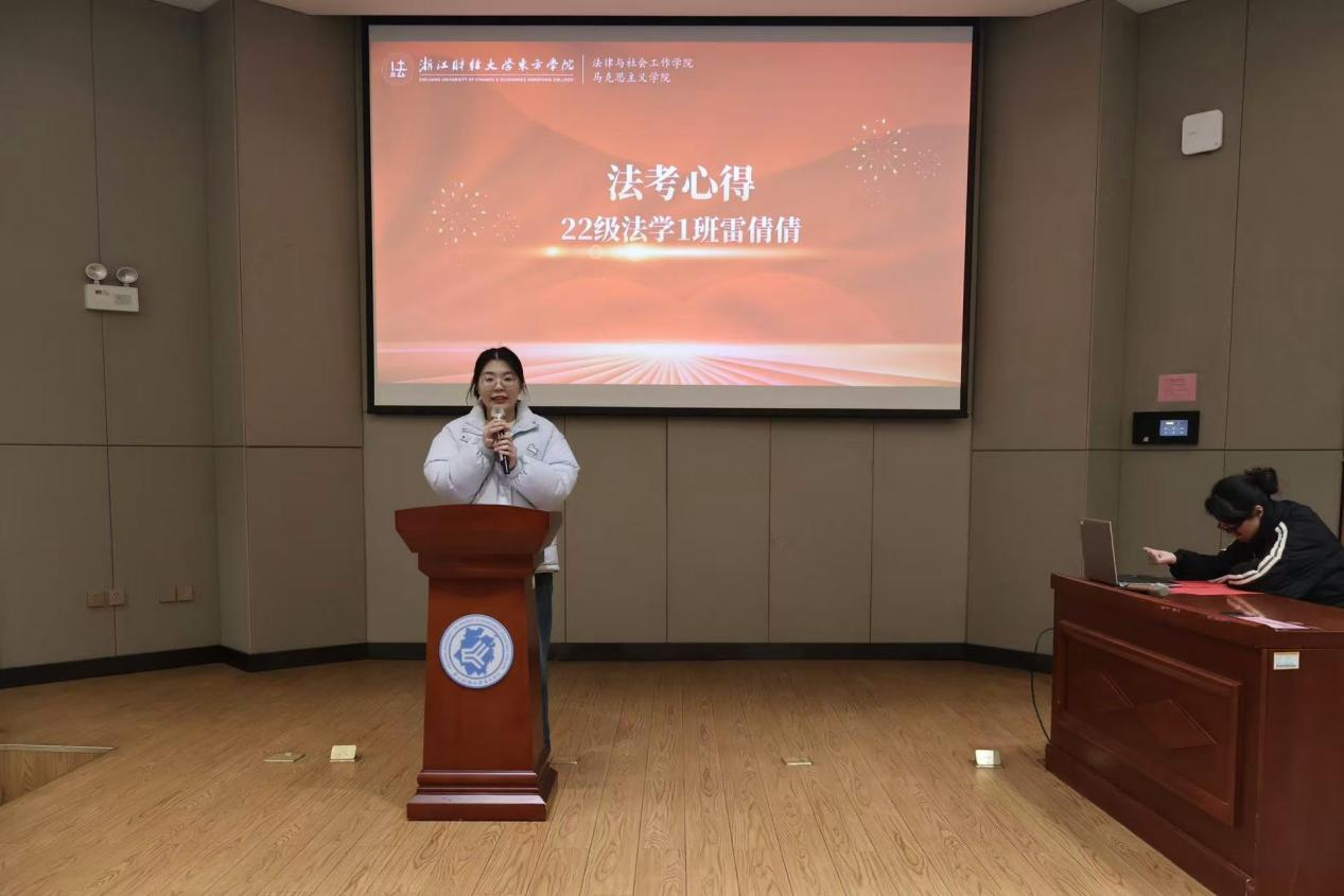 在经验分享环节,22法学1班雷倩倩同学作为代表发言,结合自身备考经历,分享了学习方法与心态调整技巧,为在座同学提供了宝贵参考。